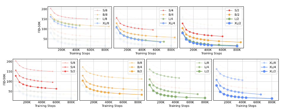 그림 6. DiT 모델의 확장은 훈련의 모든 단계에서 FID를 개선합니다. 우리는 12개의 DiT 모델에 대한 훈련 반복에 따른 FID-50K를 보여줍니다. 상단 행: 패치 크기를 일정하게 유지하면서 FID를 비교합니다. 하단 행: 모델 크기를 일정하게 유지하면서 FID를 비교합니다. 트랜스포머 백본의 확장은 모든 모델 크기와 패치 크기에서 더 나은 생성 모델을 제공합니다.