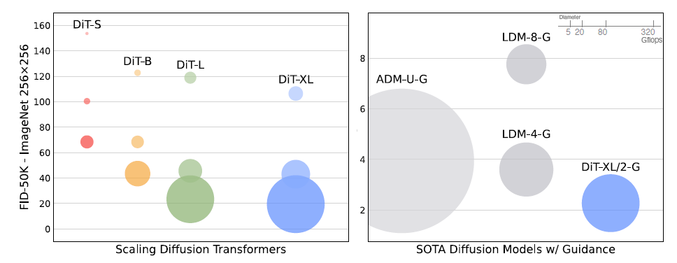 그림 2. 확산 트랜스포머(DiTs)를 사용한 ImageNet 생성. 버블 면적은 확산 모델의 플롭 수를 나타냅니다. 왼쪽: DiT 모델의 400K 학습 반복 시 FID-50K(낮을수록 좋음). 모델의 플롭 수가 증가함에 따라 FID 성능이 꾸준히 개선됩니다. 오른쪽: 우리의 최고 모델인 DiT-XL/2는 계산 효율적이며, ADM 및 LDM과 같은 모든 이전 U-Net 기반 확산 모델을 능가합니다.