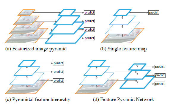 그림 1. (a) 이미지 피라미드를 사용하여 특징 피라미드를 구축하는 방법. 각 이미지 스케일에서 독립적으로 특징을 계산하는데, 이는 느립니다. (b) 최근 탐지 시스템은 더 빠른 탐지를 위해 단일 스케일 특징만을 사용하는 것을 선택했습니다. (c) 대안으로, ConvNet에 의해 계산된 피라미드 특징 계층을 마치 특징화된 이미지 피라미드처럼 재사용하는 방법이 있습니다. (d) 우리가 제안한 특징 피라미드 네트워크(FPN)는 (b)와 (c)처럼 빠르면서도 더 정확합니다. 이 그림에서 특징 맵은 파란색 윤곽선으로 표시되며, 두꺼운 윤곽선은 의미적으로 더 강력한 특징을 나타냅니다.