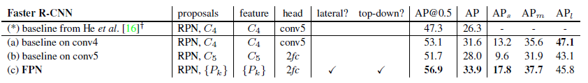 표 5. Faster R-CNN과 우리의 FPN을 사용한 추가 객체 탐지 결과