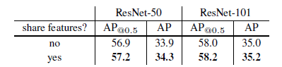 minival 세트에서 평가된 Faster R-CNN과 FPN을 사용한 추가 객체 탐지 결과입니다. 특징 공유는 학습 시간을 1.5배 증가시키지만(4단계 학습 [29] 사용), 테스트 시간을 줄입니다.