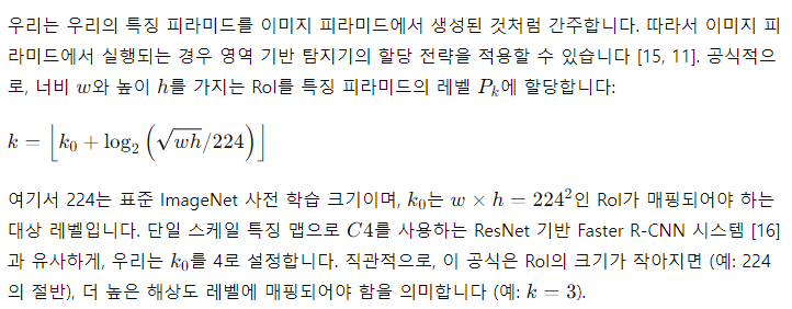 Fast R-CNN [11]은 Region-of-Interest (RoI) 풀링을 사용하여 특징을 추출하는 영역 기반 객체 탐지기입니다. Fast R-CNN은 일반적으로 단일 스케일 특징 맵에서 수행됩니다. 이를 FPN과 함께 사용하기 위해, 우리는 서로 다른 스케일의 RoI를 피라미드 레벨에 할당해야 합니다.