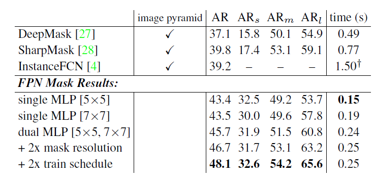 처음 5k개의 COCO 검증 이미지에서 평가된 인스턴스 세그먼트 제안입니다. 모든 모델은 학습 세트에서 학습되었습니다. DeepMask, SharpMask, FPN은 ResNet-50을 사용하고 Instance-FCN은 VGG-16을 사용합니다. DeepMask와 SharpMask 성능은 https://github.com/facebookresearch/deepmask에서 사용할 수 있는 모델로 계산되었습니다(둘 다 '줌' 변형입니다).