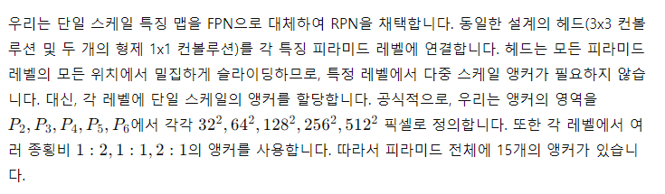 RPN [29]은 슬라이딩 윈도우 방식의 클래스 비인식 객체 탐지기입니다. 원래 RPN 설계에서는, 소규모 서브네트워크가 단일 스케일 컨볼루션 특징 맵 위에서 밀집 3x3 슬라이딩 윈도우로 평가되어 객체/비객체 이진 분류 및 경계 상자 회귀를 수행합니다. 이는 3x3 컨볼루션 레이어에 의해 실현되며, 이후 두 개의 형제 1x1 컨볼루션 레이어가 분류 및 회귀를 수행합니다. 객체/비객체 기준 및 경계 상자 회귀 타겟은 앵커라는 참조 상자 집합을 기준으로 정의됩니다. 앵커는 여러 사전 정의된 스케일 및 종횡비를 가지며, 다양한 형태의 객체를 커버하기 위해 사용됩니다.
