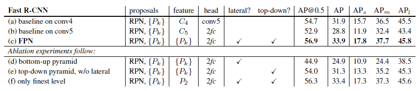 FPN이 영역 기반 탐지기에 미치는 영향을 더 잘 조사하기 위해, 우리는 고정된 제안 세트를 사용한 Fast R-CNN의 축소 실험을 수행합니다. 탐지기가 인식할 작은 객체에 대해 좋은 성능을 보이는 FPN의 RPN으로 계산된 제안을 고정합니다(표 1(c)). 단순화를 위해 Fast R-CNN과 RPN 간의 특징을 공유하지 않습니다(명시된 경우 제외).