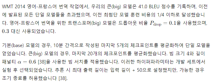 WMT 2014 영어-독일어 번역 작업에서, 트랜스포머의 큰(big) 모델(표 2에서 Transformer (big))은 이전에 보고된 최고 모델들(앙상블 포함)을 2.0 BLEU 이상 초과하여 28.4라는 새로운 최고 BLEU 점수를 기록했습니다. 이 모델의 구성은 표 3의 하단에 나와 있습니다. 훈련은 8개의 P100 GPU에서 3.5일이 소요되었습니다. 심지어 기본(base) 모델도 모든 이전에 발표된 모델들과 앙상블을 초과했으며, 경쟁 모델들의 훈련 비용의 일부만으로도 뛰어난 성능을 발휘했습니다.