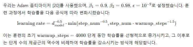 우리는 8개의 NVIDIA P100 GPU가 장착된 한 대의 머신에서 모델을 훈련했습니다. 논문 전반에 걸쳐 설명된 하이퍼파라미터를 사용하는 기본(base) 모델의 경우, 각 훈련 단계는 약 0.4초가 소요되었습니다. 우리는 기본 모델을 총 100,000단계, 즉 12시간 동안 훈련했습니다. 큰(big) 모델(표 3의 하단 행에 설명된 모델)의 경우, 각 단계는 1.0초가 소요되었습니다. 큰 모델은 300,000단계(3.5일) 동안 훈련되었습니다.