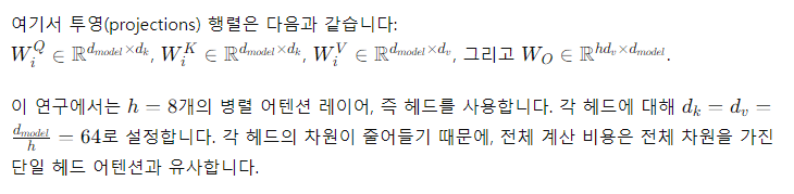 멀티헤드 어텐션은 모델이 서로 다른 위치에서 서로 다른 표현 하위 공간(representation subspaces)에서 정보를 동시에 주목할 수 있도록 합니다. 단일 어텐션 헤드를 사용하면 평균화가 이를 방해합니다.