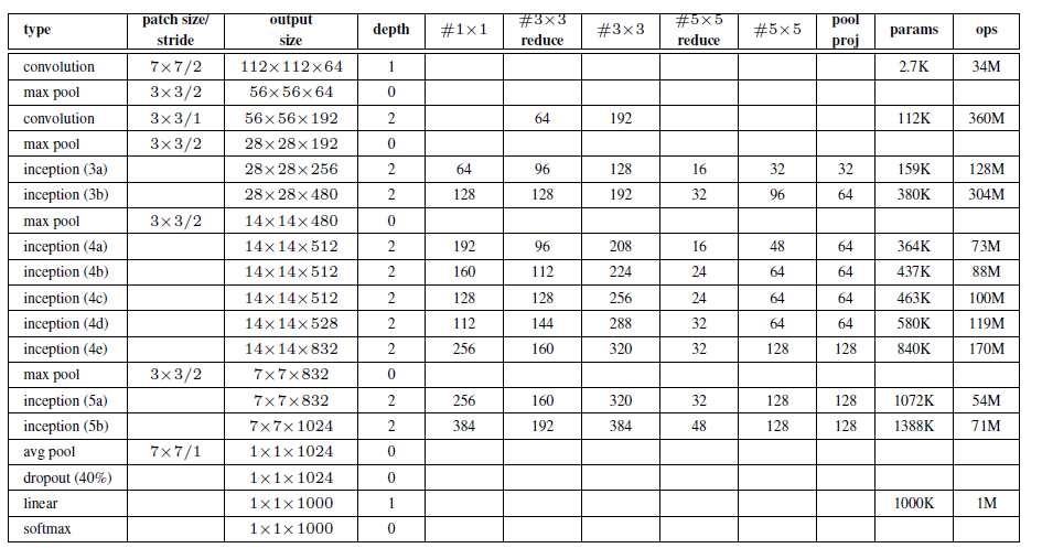 표 1에서 GoogLeNet의 Inception 아키텍처 구현에 대한 세부 정보를 설명