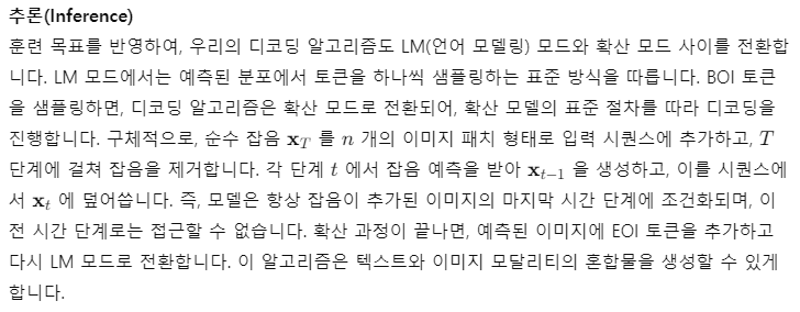 다중 모달 생성 모델은 이산적인 요소(예: 텍스트나 코드)와 연속적인 요소(예: 이미지, 오디오, 비디오 데이터)를 인식하고 처리하며 생성할 수 있어야 합니다. 다음 토큰 예측 목표로 훈련된 언어 모델이 이산 모달리티에서 우세한 반면(OpenAI et al., 2024; Dubey et al., 2024), 확산 모델(Ho et al., 2020; Rombach et al., 2022a)과 그 일반화 모델(Lipman et al., 2022)은 연속 모달리티를 생성하는 데 있어서 최첨단 기술로 평가받고 있습니다(Dai et al., 2023; Esser et al., 2024b; Bar-Tal et al., 2024). 이러한 접근법을 결합하려는 많은 시도가 있었으며, 여기에는 언어 모델이 확산 모델을 도구로 사용하도록 확장하거나(Liu et al., 2023), 사전 훈련된 확산 모델을 언어 모델에 접목시키는 방법(Dong et al., 2023; Koh et al., 2024) 등이 포함됩니다. 또 다른 방법으로는 연속 모달리티를 양자화하여(Van Den Oord et al., 2017) 이산 토큰으로 표준 언어 모델을 훈련시키는 것인데(Ramesh et al., 2021; Yu et al., 2022, 2023), 이는 모델의 아키텍처를 단순화하지만 정보 손실이 발생할 수 있습니다. 이번 연구에서는 이산 텍스트 토큰을 예측하고 연속적인 이미지를 확산시키는 단일 모델을 훈련시킴으로써 정보 손실 없이 두 가지 모달리티를 완전히 통합할 수 있음을 보여줍니다.