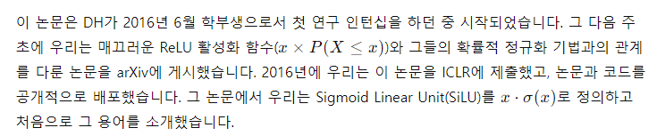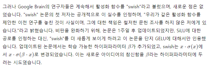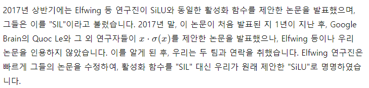 따로 Reddit 게시물 "Google은 연구에서 공로 할당 문제를 가지고 있다"가 인기를 끌었으며, 그들은 SiLU를 swish라고 부르는 문제에 초점을 맞췄습니다. 예로 "Smooth Adversarial Training" 논문이 언급되었는데, 여기서 swish라는 용어가 SiLU 대신 사용되었습니다. swish 논문의 주요 저자는 이 게시물의 영향을 받아 논문을 업데이트하고 "swish"를 "SiLU"로 교체하며, 이 논문을 아이디어의 원천으로 인정했습니다. 이 게시물 이후로, TensorFlow와 PyTorch와 같은 인기 있는 라이브러리에서도 함수의 이름을 "swish"에서 "SiLU"로 변경하기 시작했습니다. 문제를 주의 깊게 살펴본 이들 사이에서는 이 문제가 대부분 해결되었으며, 우리는 이러한 공로가 대체로 인정된 것에 대해 감사하게 생각합니다.