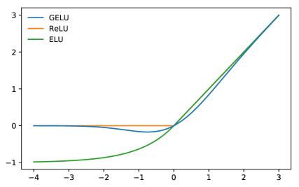 그림 1: GELU(μ=0, σ=1), ReLU, 그리고 ELU(α=1)