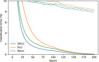 우리의 얕은 합성곱 신경망은 Salimans & Kingma(2016)의 아키텍처와 훈련 절차를 따르는 9개 층으로 이루어진 네트워크이며, 훈련 속도를 높이기 위해 배치 정규화를 사용합니다. 이 아키텍처는 부록 A에 설명되어 있으며, 최근에 데이터 증강 없이 CIFAR-10에서 최신 성능을 달성했습니다. 이 네트워크는 데이터 증강 없이 훈련되었습니다. 학습률 {10^{-3}, 10^{-4}, 10^{-5}을 튜닝하고, 5천 개의 검증 샘플을 사용한 후 교차 검증에서 선택된 학습률을 기반으로 전체 훈련 세트를 다시 훈련합니다. 네트워크는 200에포크 동안 Adam 옵티마이저로 최적화되며, 100번째 에포크에서 학습률이 선형적으로 0으로 감소합니다. 결과는 그림 6에 나타나 있으며, 각 곡선은 세 번의 실행 중 중간값입니다. 결국, GELU는 중간 오류율 7.89%를 기록했으며, ReLU는 8.16%, ELU는 8.41%를 기록했습니다.
