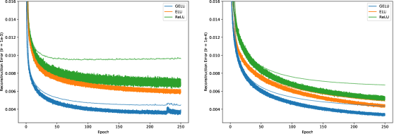 이제 자가 지도 학습(self-supervised learning) 설정에서 MNIST 데이터셋으로 심층 오토인코더를 훈련합니다(Desjardins et al., 2015). 이를 위해 네트워크는 1000, 500, 250, 30, 250, 500, 1000의 순서로 각 층의 너비를 설정한 구조를 사용합니다. 다시 Adam 옵티마이저와 배치 크기 64를 사용하며, 손실 함수는 평균 제곱 오차입니다. 학습률을 10^{-3}에서 10^{-4}로 조정하며, 학습률 0.01도 시도했지만 ELU는 발산하였고, GELU와 ReLU는 수렴이 잘 이루어지지 않았습니다. 그림 4의 결과는 GELU가 다양한 학습률을 수용하며 다른 비선형성 함수보다 성능이 우수하다는 것을 나타냅니다.