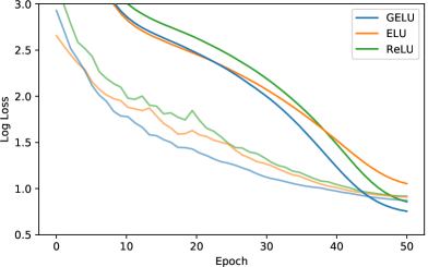 이 비선형성이 이전 활성화 함수들과 경쟁할 수 있음을 검증하기 위해 Clevert et al. (2016)의 실험을 재현했습니다. 이를 위해, 우리는 GELU(μ=0, σ=1), ReLU, ELU(α=1)를 사용하여 완전 연결 신경망을 훈련시켰습니다. 각 8개 층으로 구성된, 128개의 뉴런을 가진 신경망은 배치 크기 128로 50에포크 동안 훈련되었습니다. 이 실험은 Clevert et al.의 실험과 다르게 Adam 옵티마이저(Kingma & Ba, 2015)를 사용하고, 모멘텀이 없는 확률적 경사 하강법 대신 사용했으며, 또한 비선형성이 드롭아웃에 얼마나 잘 대처하는지를 보여줍니다. 가중치는 단위 노름 행렬(unit norm rows)로 초기화되었으며, 이는 각 비선형성의 성능에 긍정적인 영향을 미친다는 연구(Hendrycks & Gimpel, 2016; Mishkin & Matas, 2016; Saxe et al., 2014)를 참고한 것입니다. 학습률은 { 10 − 3 , 10 − 4 , 10 − 5 } 범위에서 5천 개의 훈련 세트 검증 샘플을 사용해 튜닝되었으며, 5번의 실행에서 중간값을 사용했습니다. 이러한 분류기를 사용하여 그림 3에서 GELU를 사용하는 분류기가 잡음이 있는 입력에 더 강건할 수 있음을 보여줍니다. 그림 2는 GELU가 드롭아웃 유무에 관계없이 가장 낮은 중간값 훈련 로그 손실을 가지는 경향이 있음을 보여줍니다. 따라서, 비록 GELU가 다른 확률적 과정에서 영감을 받았지만 드롭아웃과 잘 조화됨을 알 수 있습니다.