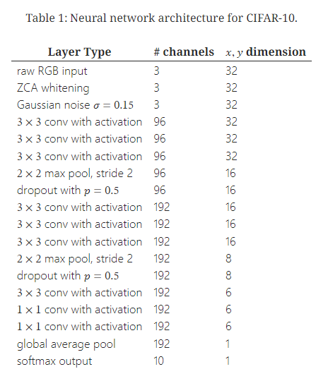 표 1: CIFAR-10을 위한 신경망 아키텍처.