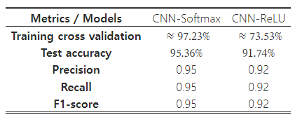 CNN-Softmax 모델과 CNN-ReLU 모델의 정확도(%) 비교. 훈련 교차 검증은 10번의 분할에서 얻은 평균 교차 검증 정확도입니다. 테스트 정확도는 보지 않은 데이터에서의 성능을 나타냅니다. 정밀도(Precision), 재현율(Recall), F1-스코어는 보지 않은 데이터에서의 성능을 나타냅니다.