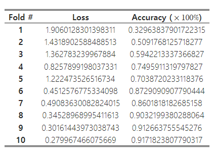 표 8. Fashion-MNIST 분류를 위한 CNN-ReLU의 10-겹 교차 검증에서 폴드별 훈련 정확도 및 손실.
