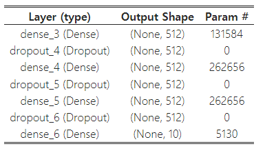 표 2는 실험에 사용된 피드포워드 신경망(FFNN)의 구조를 보여줍니다. 마지막 층인 dense_6는 실험에서 Softmax 분류기와 ReLU 분류기를 사용했습니다.