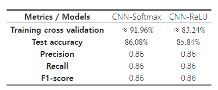 MNIST 분류에서의 결과와 유사하게, CNN-ReLU는 교차 검증에서 훈련 정확도를 확인한 결과(표 8 참조), CNN-Softmax보다 수렴 속도가 느려 성능이 낮았습니다. 테스트 정확도는 약간 낮았지만, CNN-ReLU는 CNN-Softmax와 동일한 F1-스코어 0.86을 기록했습니다. 이는 MNIST 분류에서의 결과와도 유사합니다.