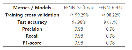 Softmax 기반 FFNN이 ReLU 기반 FFNN보다 약간 더 높은 테스트 정확도를 가졌음에도 불구하고, 두 모델 모두 F1-스코어가 0.98이었습니다. 이러한 결과는 FFNN-ReLU가 기존의 FFNN-Softmax와 동등한 성능을 보인다는 것을 의미합니다.