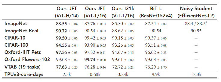 우리는 먼저 가장 큰 모델인 ViT-H/14와 ViT-L/16을 문헌에 보고된 최신 CNN들과 비교합니다. 첫 번째 비교 지점은 대형 ResNet을 사용한 지도 전이 학습을 수행하는 Big Transfer(BiT)(Kolesnikov et al., 2020)입니다. 두 번째는 Noisy Student(Xie et al., 2020)로, 이는 ImageNet과 라벨이 제거된 JFT-300M에서 반지도 학습을 사용해 훈련된 대형 EfficientNet입니다. 현재 Noisy Student는 ImageNet에서 최신 성능을 보유하고 있으며, BiT-L은 여기서 보고된 다른 데이터셋에서 최신 성능을 보이고 있습니다. 모든 모델은 TPUv3 하드웨어에서 훈련되었으며, 우리는 각 모델의 사전 학습에 걸린 TPUv3 코어-일을 보고합니다. 이는 TPU v3 코어(칩당 2개)를 사용한 훈련 시간(일)을 곱한 값입니다.