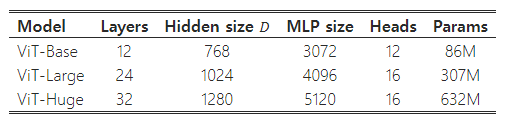 표 1: Vision Transformer 모델 변형의 세부 사항.