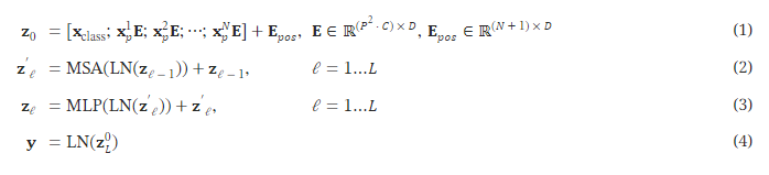 Transformer 인코더(Vaswani et al., 2017)는 교차적으로 다중 헤드 자기 주의(MSA, 부록 A 참조)와 MLP 블록(Eq. 2, 3)으로 구성됩니다. 각 블록 앞에는 Layernorm(LN)이 적용되고, 각 블록 후에는 잔차 연결이 추가됩니다. (Wang et al., 2019; Baevski & Auli, 2019). MLP는 GELU 비선형성을 가진 두 개의 계층으로 이루어져 있습니다.