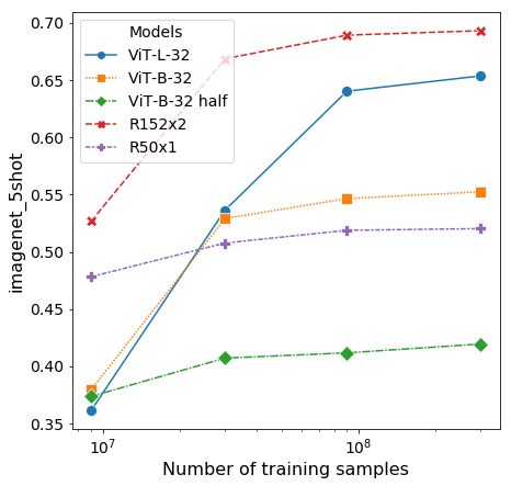 그림 4: ImageNet에서 사전 학습 크기에 따른 선형 few-shot 평가