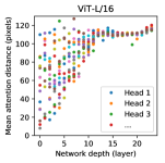 자기 주의(self-attention)는 ViT가 가장 낮은 계층에서도 이미지 전체의 정보를 통합할 수 있게 해줍니다. 우리는 네트워크가 이 기능을 어느 정도 활용하는지 조사했습니다. 특히, 주의 가중치를 기반으로 정보가 통합되는 이미지 공간 내 평균 거리를 계산했습니다(그림 7, 오른쪽). 이 "주의 거리"는 CNN의 수용 영역 크기와 유사합니다. 우리는 일부 헤드가 가장 낮은 계층에서도 이미 이미지 대부분에 주의를 기울이고 있음을 발견했습니다. 이는 전역적으로 정보를 통합할 수 있는 모델의 능력이 실제로 사용되고 있음을 보여줍니다. 다른 헤드는 일관되게 낮은 계층에서 작은 주의 거리를 유지합니다. 이러한 국소화된 주의는 Transformer 앞에 ResNet을 적용하는 하이브리드 모델에서는 덜 두드러집니다(그림 7, 오른쪽). 이는 CNN의 초기 합성곱 계층과 유사한 기능을 수행할 수 있음을 시사합니다. 또한, 네트워크 깊이가 깊어짐에 따라 주의 거리가 증가합니다. 전체적으로, 모델은 분류에 의미 있는 이미지 영역에 주의를 기울입니다(그림 6 참조).