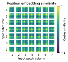 투사 이후, 학습된 위치 임베딩이 패치 표현에 추가됩니다. 그림 7(중앙)은 모델이 이미지 내에서 거리를 위치 임베딩의 유사성으로 인코딩하는 방법을 학습했음을 보여줍니다. 즉, 가까운 패치일수록 더 유사한 위치 임베딩을 갖는 경향이 있습니다. 또한, 행-열 구조가 나타납니다. 같은 행/열에 있는 패치들은 유사한 임베딩을 가집니다. 마지막으로, 더 큰 그리드에서는 때때로 사인파 구조가 나타납니다(부록 D 참조). 위치 임베딩이 2D 이미지의 위상을 나타내도록 학습된다는 점은, 왜 2D 인식을 고려한 수작업 임베딩 변형들이 성능을 개선하지 못하는지 설명해줍니다(부록 D.4 참조).