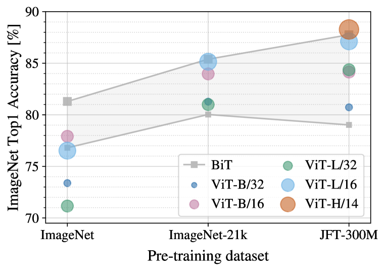 작은 데이터셋에서 사전 학습했을 때, 큰 ViT 모델은 BiT ResNet(음영 처리된 영역)보다 성능이 낮지만, 더 큰 데이터셋에서 사전 학습했을 때는 더 뛰어납니다. 마찬가지로, 더 큰 ViT 변형들은 데이터셋이 커질수록 작은 모델들을 능가합니다.