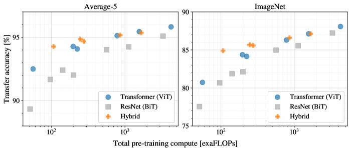 그림 5: 다양한 아키텍처에 대한 사전 학습 계산 자원 대비 성능: Vision Transformer, ResNet, 하이브리드 모델