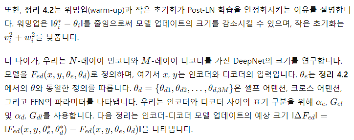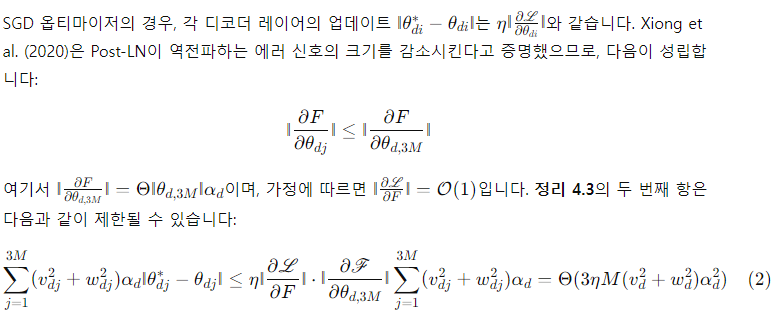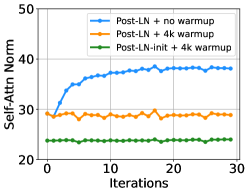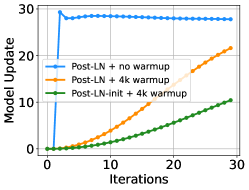여기서 x는 입력을, θ_i는 번째 업데이트 후의 모델 파라미터를 나타냅니다. Post-LN은 학습 초기에 폭발적인 업데이트를 겪고, 그 후에는 거의 업데이트가 이루어지지 않습니다. 이는 모델이 잘못된 지역 최적점에 갇혔다는 것을 의미합니다. 워밍업(warm-up)과 더 나은 초기화는 이 문제를 완화하여 모델이 원활하게 업데이트될 수 있도록 돕습니다. 업데이트가 폭발하면 LN에 대한 입력이 커지게 됩니다(Figure 4(b) 및 Figure 4(c) 참조). Xiong et al. (2020)의 이론적 분석에 따르면, LN을 통과하는 기울기의 크기는 입력 크기에 반비례합니다: