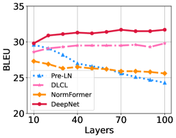 Post-LN 베이스라인과 비교했을 때, Pre-LN을 사용하는 모델들은 더 안정적이었습니다. 기본 Pre-LN과 DLCL 모두 100L-100L로 확장할 수 있었으며, 50L-50L NormFormer도 성공적으로 학습되었습니다. 그럼에도 불구하고, Pre-LN 모델은 수렴된 Post-LN 모델에 비해 BLEU 점수가 0.5~1.0점 하락했습니다. 이는 Pre-LN의 하위 레이어에서의 기울기가 상위 레이어보다 더 커지는 문제 때문이라고 추정됩니다(Shleifer et al., 2021). 이 문제는 미래의 연구로 남겨두었습니다. 반면, DeepNet은 Post-LN을 사용하여 이 문제를 완화하며, 모든 Pre-LN 베이스라인보다 더 나은 성능을 보였습니다.