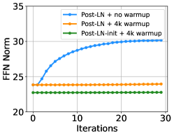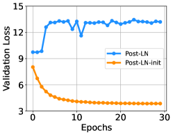 여기서 d'는 입력과 출력 차원의 평균을 나타냅니다. 우리는 이 모델을 Post-LN-init이라고 명명합니다. 이전 연구(Zhang et al., 2019a)와는 달리, 우리는 상위 레이어 대신 하위 레이어의 스케일을 줄였습니다. 이는 기울기 스케일과 모델 업데이트의 영향을 분리하는 데 도움이 된다고 믿습니다. 또한, Post-LN-init은 Post-LN과 동일한 아키텍처를 사용하기 때문에 아키텍처로 인한 영향을 제거할 수 있습니다.