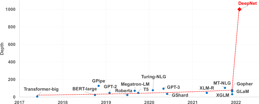 최근 몇 년 동안 대규모 트랜스포머(Transformer) 모델로의 전환이 이루어졌습니다. 모델의 용량은 수백만 개의 파라미터(Devlin et al., 2019; Conneau et al., 2020)에서 수십억 개(Radford et al., 2019; Brown et al., 2020; Huang et al., 2019; Raffel et al., 2020; Lepikhin et al., 2021; Rae et al., 2021; Lin et al., 2021; Smith et al., 2022), 그리고 심지어 수조 개(Du et al., 2021)까지 크게 증가했습니다. 대규모 모델은 다양한 작업에서 최첨단 성능을 제공하며, few-shot 및 zero-shot 학습에서 인상적인 능력을 보여줍니다. 그러나 수많은 파라미터에도 불구하고 트랜스포머의 깊이는 학습 불안정성 때문에 제한됩니다(Figure 1에서 보여준 것처럼).