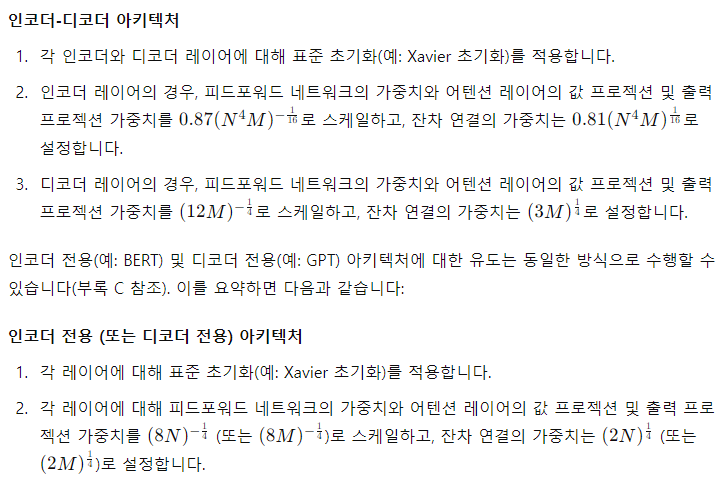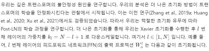 이 내용은 트랜스포머의 깊이가 깊어질수록 발생할 수 있는 학습 불안정성 문제를 해결하기 위해 적절한 초기화 전략이 얼마나 중요한지를 설명하는 과정입니다. Xavier 초기화를 기반으로 레이어별 가중치를 스케일 조정함으로써 깊은 네트워크에서 안정적인 학습이 가능해집니다.