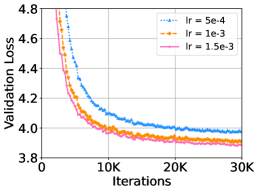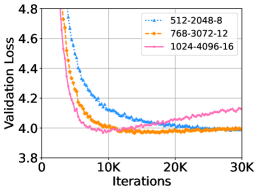 우리는 DeepNet을 더 큰 학습률, 배치 크기, 히든 차원으로 각각 확장했습니다. 각 실험에서 다른 하이퍼파라미터는 고정한 채 하나의 하이퍼파라미터만 변경했습니다. Figure 7은 WMT-17 검증 세트에서의 손실 곡선을 보여줍니다. 이 결과는 DeepNet이 가장 큰 설정에서도 문제없이 학습될 수 있음을 보여줍니다. 히든 크기 1024를 가진 DeepNet은 10,000 스텝 이후 과적합으로 인해 손실이 증가했습니다. 또한, 더 큰 설정에서 DeepNet은 더 빠른 수렴과 더 낮은 검증 손실을 보이며 이점을 얻을 수 있음을 보여줍니다.