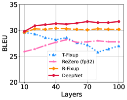 LN 없이 학습하는 방법들과도 DeepNet을 비교했습니다. R-Fixup과 T-Fixup 모두 더 나은 초기화 방법을 도입하여 LN이 없는 트랜스포머의 50-50 레이어 학습을 안정화했지만, Post-LN을 사용하는 모델들보다는 성능이 좋지 않았습니다. 또한, 반 정밀도(half-precision)는 ReZero의 학습을 불안정하게 만들어 18-18 레이어 모델에서 발산(divergence)이 발생했습니다. 이는 Liu et al. (2020)에서도 언급된 바 있습니다. 게다가 더 깊은 모델들(50L-50L)은 얕은 모델들(18L-18L)보다 성능이 더 나아지지 않았습니다. 반면, DeepNet은 이러한 방법들보다 더 나은 번역 정확도를 달성했으며, 더 깊은 모델로 확장해도 성능에 해를 끼치지 않았습니다.