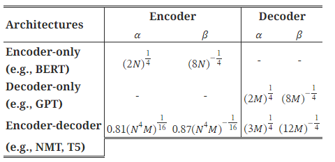 Figure 2: (a) DeepNorm의 의사 코드. 여기서 우리는 Xavier 초기화(Glorot와 Bengio, 2010)를 예시로 사용했으며, 다른 표준 초기화 방법으로 대체할 수 있습니다. 여기서 α는 상수입니다. (b) 다양한 아키텍처(예: N-레이어 인코더, M-레이어 디코더)에 대한 DeepNorm의 파라미터.