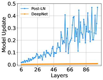 Post-LN과 비교하여, 우리는 IWSLT-14 독일어-영어 번역 데이터셋에서 DeepNet의 학습 초기 단계에서의 모델 업데이트를 시각화했습니다. Figure 5는 DeepNet의 모델 업데이트가 거의 일정한 반면, Post-LN의 모델 업데이트는 폭발적인 경향을 보인다는 것을 보여줍니다.