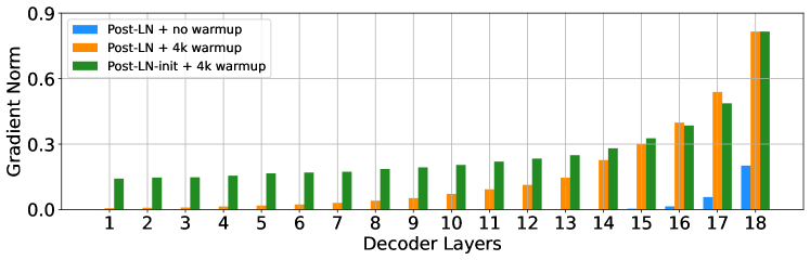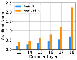 우리는 IWSLT-14 독일어-영어 기계 번역 데이터셋에서 18L-18L Post-LN과 18L-18L Post-LN-init 모델을 훈련했습니다. Figure 3은 두 모델의 기울기와 검증 손실 곡선을 시각화한 것입니다. Figure 3(c)에 따르면, Post-LN-init은 수렴했으나 Post-LN은 그렇지 않았습니다. Post-LN-init은 가중치가 축소되었음에도 불구하고 마지막 몇 개의 레이어에서 더 큰 기울기 노름을 보였습니다. 또한, 모델 깊이가 6L-6L에서 24L-24L로 변화하는 동안 마지막 디코더 레이어의 기울기 노름을 시각화했습니다. Figure 3에서 볼 수 있듯이, Post-LN-init의 마지막 레이어에서의 기울기 노름은 모델 깊이에 관계없이 Post-LN보다 훨씬 큽니다. 이를 통해, 깊은 레이어에서의 폭발적인 기울기가 Post-LN의 불안정성의 근본 원인이 아니며, 모델 업데이트의 규모가 불안정성의 주요 원인임을 알 수 있습니다.