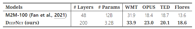 우리는 DeepNet을 최신 다국어 NMT 모델인 M2M-100(Fan et al., 2021)과 비교했습니다. M2M-100은 24 레이어 인코더, 24 레이어 디코더, 4,096 히든 크기를 가지고 있으며, 총 120억 개의 파라미터를 포함하고 있습니다. 이에 비해 DeepNet은 32억 개의 파라미터만으로 더 깊고 좁은 구조입니다. 공정한 비교를 위해, 우리는 빔 크기 5와 길이 패널티 1을 사용하여 모델을 생성했습니다.