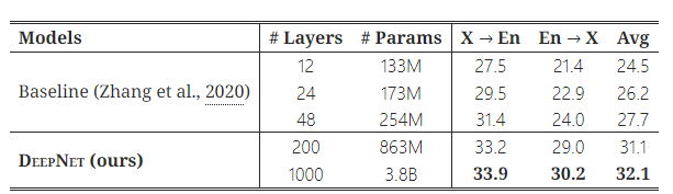 Table 2: OPUS-100 테스트 셋에서 DeepNet과 베이스라인의 평균 BLEU 점수를 비교한 표.