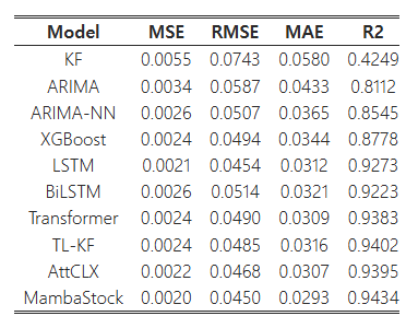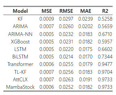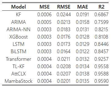 MambaStock은 또한 하이브리드 모델들보다도 뛰어난 성능을 보였습니다. TL-KF 또는 AttCLX와 비교할 때, MambaStock은 데이터 내의 시간적 의존성과 복잡한 패턴을 효과적으로 포착하는 능력을 보여주었습니다. MambaStock의 우수한 성능은 시퀀스 데이터에서 자주 발견되는 복잡성과 비선형성을 포착하도록 특별히 설계된 첨단 딥러닝 아키텍처 덕분입니다. 시간적 의존성을 효과적으로 모델링하고, 관련 정보를 추출하며, 주식 시장 예측의 고유한 도전 과제를 처리하는 능력은 MambaStock을 다른 비교 대상 방법들보다도 차별화시키며, 더 높은 정확도와 우수한 성능을 제공합니다.