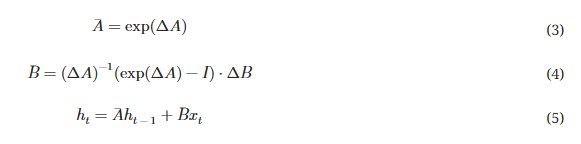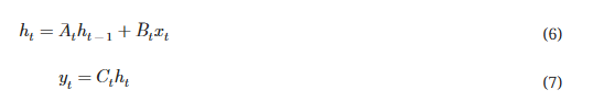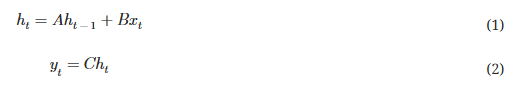 X ∈ ℝ^(B × L × D)라고 할 때, 여기서 B, L, D는 각각 배치 크기, 시간 단계, 차원을 나타냅니다. 각 배치와 각 차원에 대해, x_t, h_t, y_t는 각각 시간 t=1, 2, …, L에서의 입력, 은닉 상태 및 출력을 나타내며, S4 모델은 다음과 같이 표현할 수 있습니다.