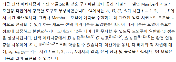 Mamba 모델 [3]은 시퀀스 모델링 분야에서 중요한 발전을 나타냅니다. 이 모델은 선택 메커니즘과 스캔 모듈로 알려진 S6를 갖춘 구조화된 상태 공간 시퀀스 모델(S4)을 통합하여 전통적인 접근 방식을 능가합니다. Mamba 모델은 전통적인 시계열 모델이 역사적으로 어려움을 겪었던 순차 데이터의 비선형 패턴을 포착하는 데 탁월합니다. Mamba의 핵심 강점은 선형 시간 복잡도를 사용하여 시퀀스를 효율적으로 모델링할 수 있는 능력에 있으며, 이는 대규모 데이터셋을 처리하는 데 적합합니다. 혁신적인 선택 메커니즘은 데이터 내의 다양한 패턴과 구조에 동적으로 적응할 수 있게 하여 더 정확한 예측을 가능하게 합니다. 또한, 스캔 모듈은 상태 공간을 스캔하여 예측에 필요한 관련 정보를 식별하는 능력을 향상시킵니다.
