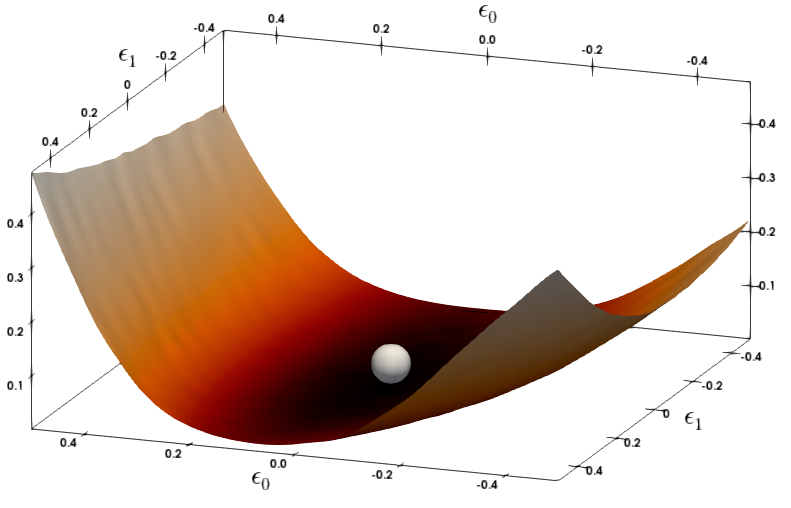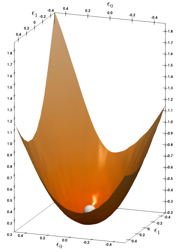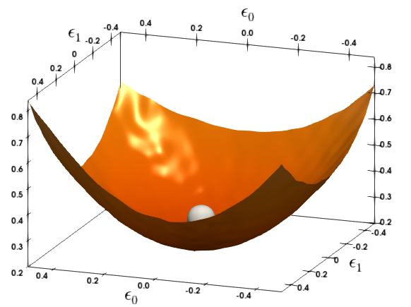 그림 3: SQuAD의 다양한 레이어에 대한 손실 지형을 Hessian의 상위 두 개 주요 고유벡터를 따라 파라미터를 변화시키면서 시각화했습니다. 은색 구체는 BERT 모델이 수렴한 파라미터 공간의 지점을 나타냅니다. SQuAD의 정지 지점에서는 두 레이어 모두 음의 고유값을 가지는 점에 주목하세요. 이는 양자화 후 SQuAD에서 상대적으로 더 큰 성능 저하가 관찰된 이유일 수 있습니다(표 1d 참조).