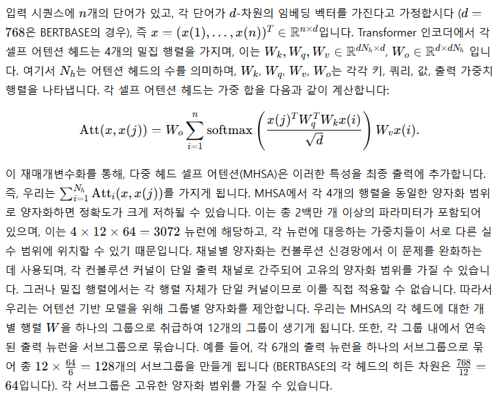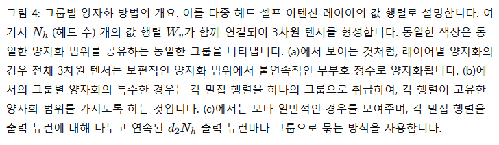 - 각 행렬이 자체적으로 가중치 범위를 가질 수 있습니다. 예를 들어 Query, Key, Value, Output 행렬이 각각의 범위를 가지면, 양자화 정밀도가 더 높아져 성능을 유지하기 쉬워집니다.